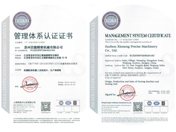 蘇州信能精密機械有限公司成立于2001年,是國家高新技術企業,是國內專業從事珩磨工藝技術研究、珩磨裝備及工具研發生產的企業。公司占地約3萬平方米,擁有機械設計與制造、電氣自動化控制、磨料磨具、材料科學等各類專業人員100多名。2011年在德國斯圖加特設立了研發平臺信能國際(德國)有限公司,2013年又收購了世界高端珩磨機制造企業德國Degen公司51%的股權,致力于高速高精珩磨機的研發與產業化。